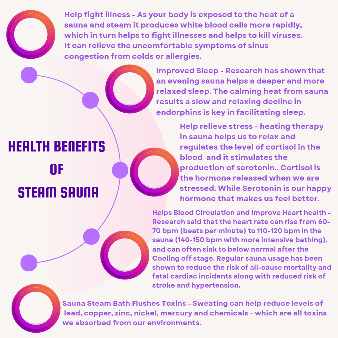 Sauna Steam Bath Flushes Toxins - Sweating can help reduce levels of lead, copper, zinc, nickel, mercury and chemicals - which are all toxins we absorbed from our environments.